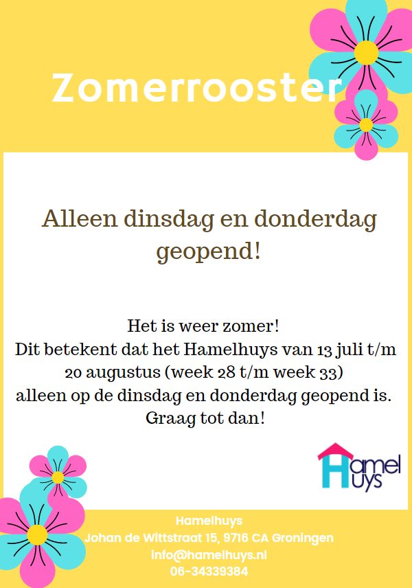 ZomerroosterNieuws / 9 juli 2021 Van 13 juli tot en met 20 augustus 2021 hanteren wij ons zomerrooster. Dit houdt in dat we in die periode op dinsdag en donderdag van 10 tot 17 uur geopend zijn.